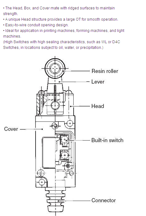 Nome prodotto: Limit Switch; N. modello: HL-5030; Azione attuatore: momentanea; Tipo di attuatore: braccio leva rotante regolabile con rullo; Tipo di contatto: 1NC + 1