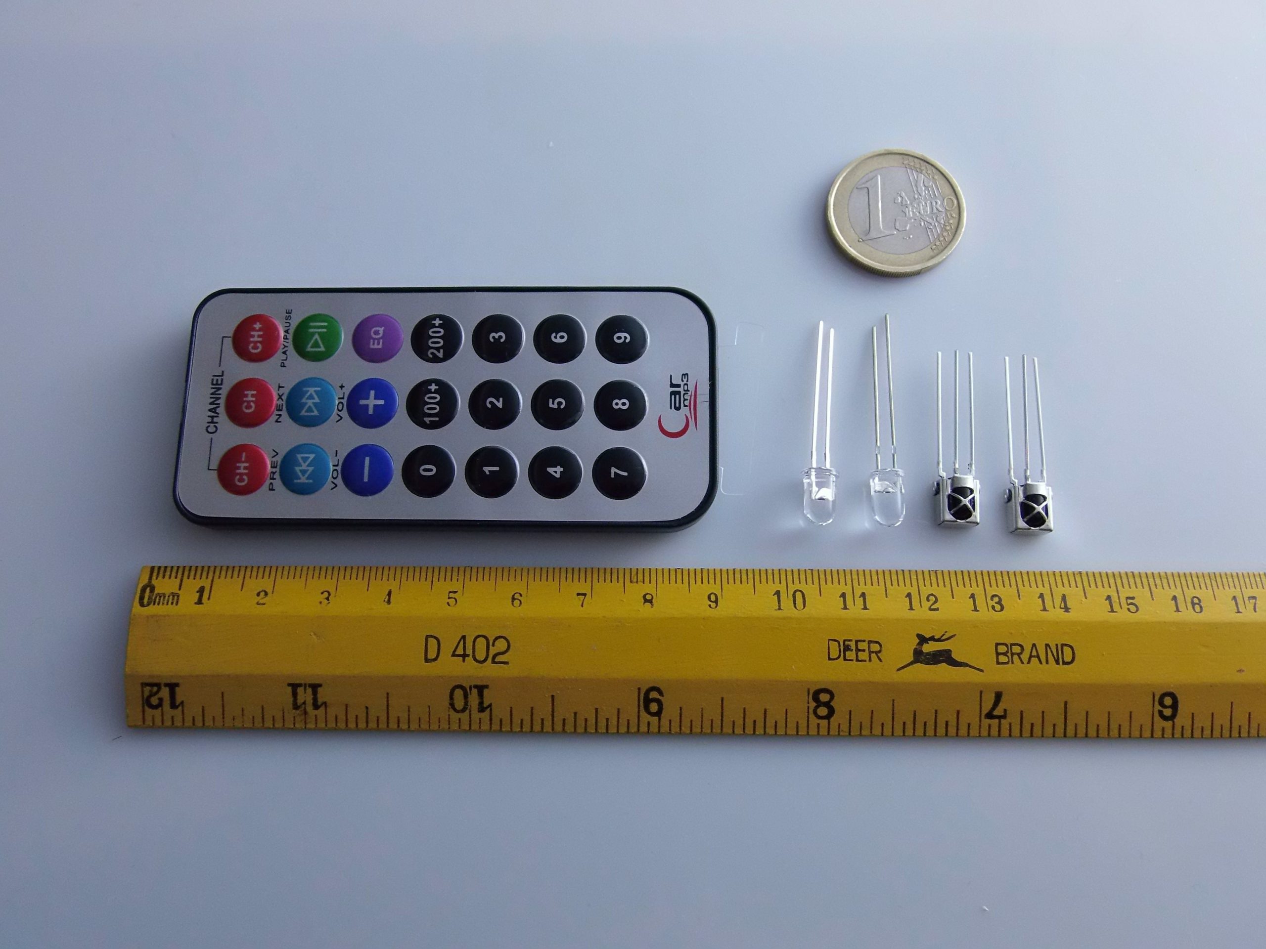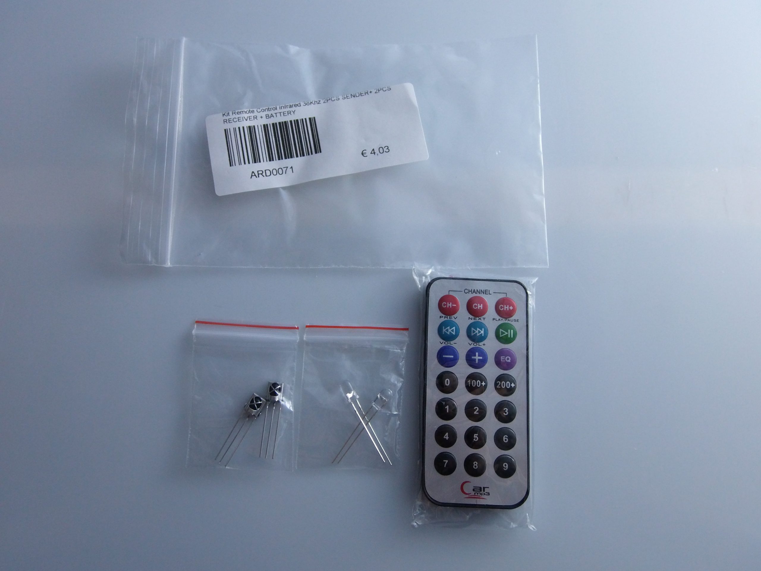 Il kit comprende un ultra-sottile telecomando a infrarossi e un modulo ricevitore 38KHz a raggi infrarossi. Il telecomando ha 20 tasti funzione. La sua trasmissione ideale per la gestione di una serie di attrezzature al coperto.