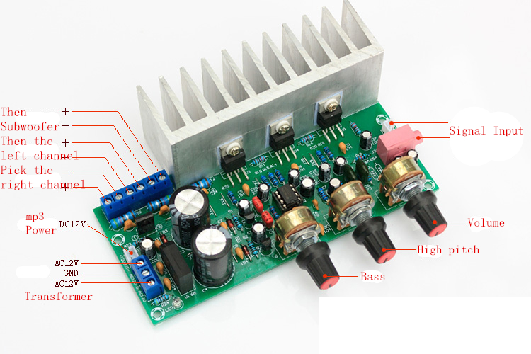 Il basso potente e le note alte non sono aspre. Utilizzo del chip come nuovo originale: l’unit di basso predefinita per 1 TDA2050– picco di uscita di 32 W, unit a doppio canale per il 2 TDA2030 – picco di uscita di 18 W + 18 W. TDA2030, LM1875, TDA2050 possono essere completamente intercambiabili, se tutti sostituiti con TDA2050 o LM1875, passare a un dissipatore di calore pi grande.