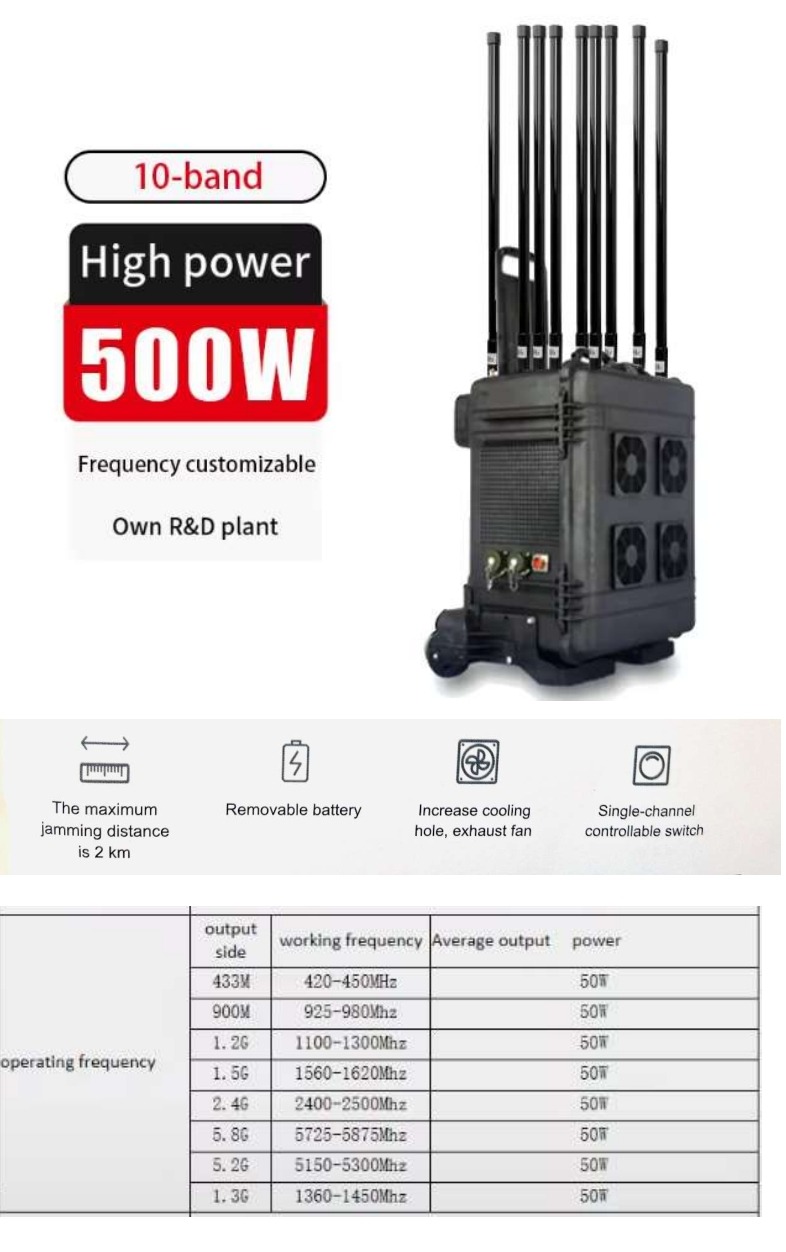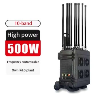 Valigia jammer anti-drone per 10 canali con potenza di 500Watt.