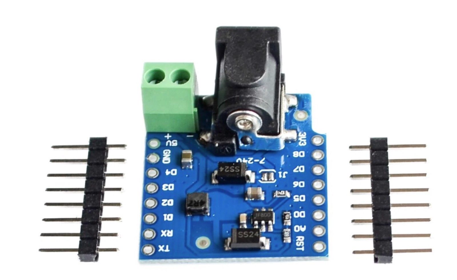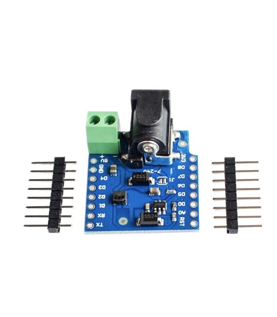 Appositamente studiato per l’alimentazione delle Wemos D1 Mini e D1 Mini Pro il Wemos DC Power Shield viene alimentato con una tensione in ingresso compresa tra 7Vcc e 24Vcc, l’uscita a 5Vcc è in grado di fornire una corrente fino a 1A.